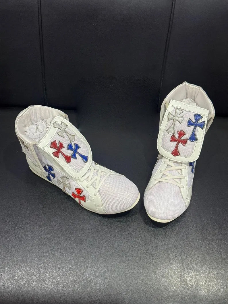 Custom chrome heart crosses leather boxing shoes, lightweight pro wrestling boots